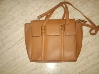Bolso de piel en color camel. - Diseño elegante y atemporal. - Asa de mano y correa. - Compartimento principal con cierre de cremallera. - Bolsillo exterior con solapa y broche.