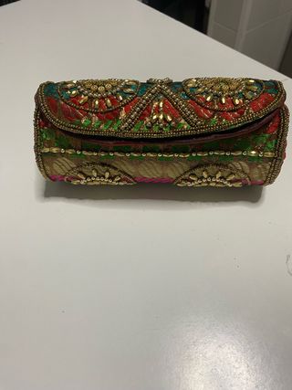 Bolso de mano muy colorido, con un diseño de fantasía y detalles bordados. Se puede colgar. - Adornos de pedrería y bordados. - Cierre de solapa. - Incluye cadena para colgar.