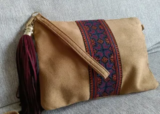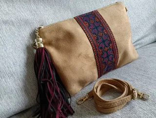 Bolso de mano con un diseño elegante y llamativo. Perfecto para complementar tu estilo. - Adorno central con banda textil bordada. - Detalle de flecos en color burdeos y negro. - Incluye correa desmontable a juego.