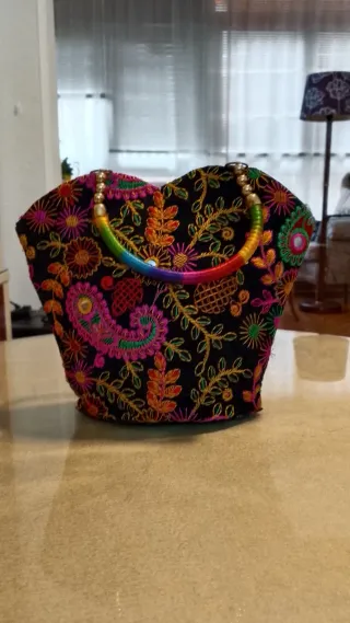 Bolso con un diseño llamativo y lleno de color. - Base negra con bordados florales y de hojas. - Asa de aro con detalles arcoíris. - Adornos de espejos pequeños integrados en el bordado.