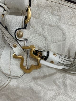 Bolso de la marca Tous en color blanco con detalles dorados. Un accesorio elegante y práctico. - Diseño texturizado. - Cierre de cremallera. - Asa de mano. - Adorno de flecos.