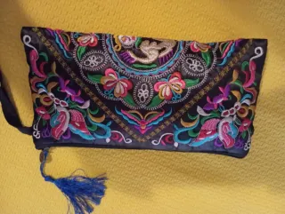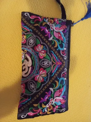 Elegante bolso de mano con un diseño bordado vibrante y detallado. - Base negra. - Bordados en tonos fucsia, azul, verde, amarillo y morado. - Cierre de cremallera. - Adorno de borla azul.