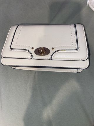 Bolso de mano en color blanco con un diseño moderno y elegante. Cuenta con asas de cadena plateadas que le dan un toque chic. En las fotografías muestro que está usado y se nota en la esquina. Pero la apariencia del conjunto del bolso es perfecto. - Material: Piel sintética. - Cierre: botón - Interior: Bolsillo pequeño con cremallera.