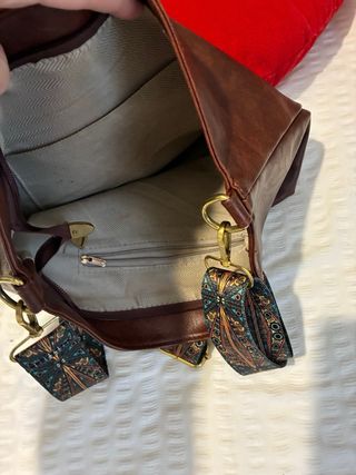 Elegante bolso con detalles dorados. - Asa de mano. - Correa ajustable para llevar al hombro o cruzado. - Cierre de cremallera. - Usado literalmente en una ocasion