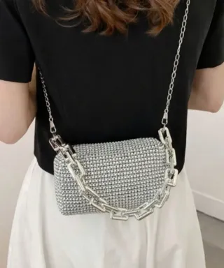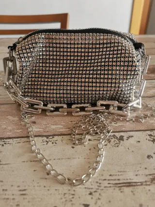 Bolso mini elegante con un diseño brillante y una cadena gruesa para sujetar en mano y otra metálica para poder llevar en hombro. Nuevo, a estrenar. Lijero. - Color Plateado y brillante - Cadena plateada gruesa cadena fina que se puede extraer.