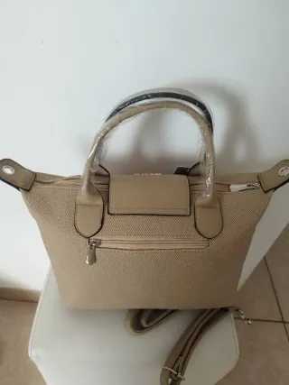 Bolso de mano con un diseño elegante y práctico. - Medidas: 36x22 cm. - Material exterior de tela con detalles en polipiel. - Cierre de cremallera. - Bolsillo exterior con cremallera. - Asa de mano y correa ajustable para hombro.