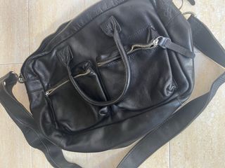 Bolso cartera de piel auténtica italiano Genuine leather. En muy buen estado por dentro y por fuera. Color negro y dorado. La parte dorada presenta algun arañazo pero dentro de la normalidad pues es la patina de oro que se le añade a la piel (ver foto). Tene diversos compartimentos y se cierra con cremallera y boton imán. Para llevar en bandolera, de la mano o del brazo. Con bastante capacidad pues posee mucho fondo. Mide 35 cms ancho x 26 cms alto. Muy llevable y práctico.