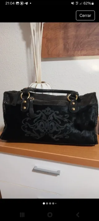 Bolso de piel con un diseño vintage y un detalle de grabado en la parte frontal. - Material exterior: Piel y pelo. - Cierre de cremallera. - Asas de mano. - Detalle de grabado ornamental.