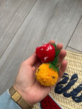 Bolso de mano tejido con un diseño veraniego. - Detalle de la palabra Aloha bordada. - Parches decorativos de piña, plátano con gafas de sol y sandía. - Adornos de pompones de colores en el lateral. - Cierre de cremallera funciona perfectamente Solo hago envíos