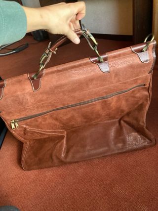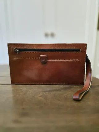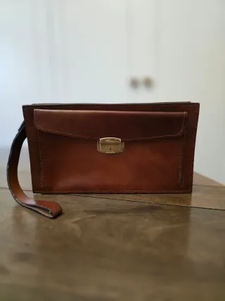 Bolso de mano de cuero con pátina, pero sin uso. Medidas: 34cm de ancho, 13cm de alto, 4cm de fondo. Asa de 18cm. Bolsillo exterior frontal con cierre metálico dorado, compartimento central con cremallera, bolsillo trasero con cremallera y espacio trasero con clip de cierre. Ha estado años guardado. - Material: Cuero genuino. - Cierre de solapa metálico dorado. - Correa de mano integrada. Mariconera.