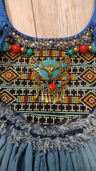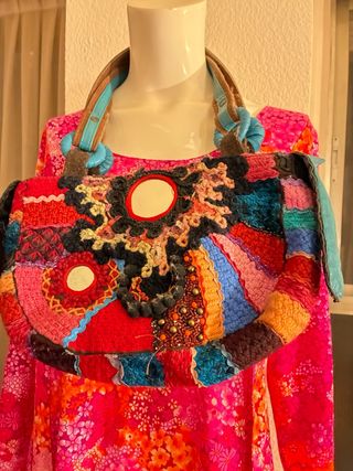 Bolso de mano de estilo fantasía con un diseño muy llamativo y original. Se encuentra en muy buen estado. - Combinación de múltiples colores y texturas. - Adornos y detalles únicos. - Asas cómodas para llevar al hombro.