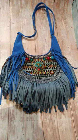 Bolso de estilo boho, ideal para complementar tu look. - Diseño artesanal único. - Adornado con flecos y detalles de cuentas. - Cierre de clip.