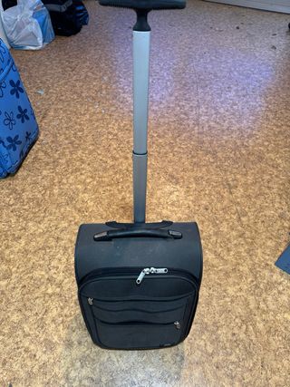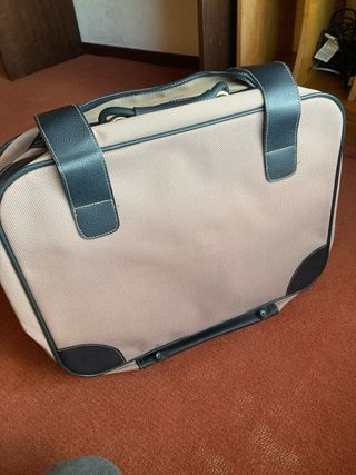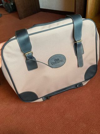 Maleta de mano de la marca Cortefiel, ideal para viajes cortos o como equipaje de cabina. Su diseño combina tonos beige y negro, aportando un toque de elegancia. - Material resistente y duradero. - Asas de mano y correa ajustable. - Compartimento principal espacioso. - Detalles en piel sintética.