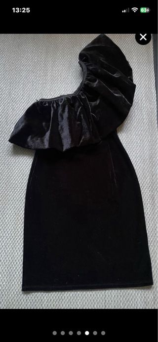 Conjunto de vestido de terciopelo negro y bolso a juego.Nuevo un uso. - Vestido de terciopelo con manga abullonada. - Incluye bolso de mano negro.