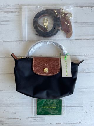 Bolso Longchamp Le Pliage XS con detalles en piel. incluye bandolera . escríbeme si te interesa - Asa corta. - Correa larga ajustable. - Cierre de cremallera y botón. - Incluye etiqueta.