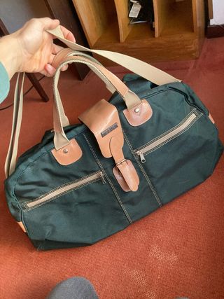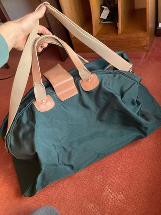 Maleta de mano de la marca NOBUCK. - Color verde con detalles en marrón. - Asa de mano y correa para hombro. - Múltiples bolsillos con cremallera.