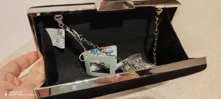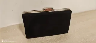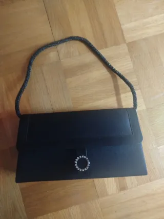 Elegante bolso de mano, perfecto para ceremonias y eventos especiales.Usado una vez. - Diseño alargado y sobrio. - Cierre con detalle de pedrería circular. - Asa de cadena fina con cuentas.