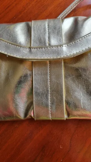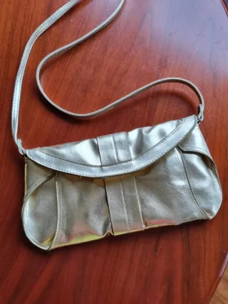 Elegante bolso de mano en tono dorado, perfecto para complementar tu atuendo. Para colgar al hombro o en bandolera. Está nuevo, no se ha usado nunca. Medidas: 30x15cm - Diseño con pliegues. - Correa delgada. - Acabado metálico.