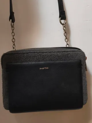 Bolso de mano o bandolera con un diseño moderno. - Exterior de tela gris y detalle frontal en piel negra. - Cierre de cremallera superior. - Dos compartimentos. - Correa ajustable con cadena.