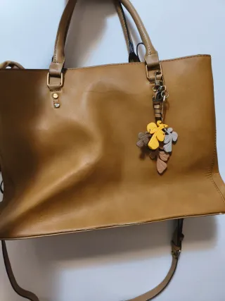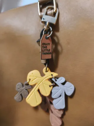 Bolso de piel en tono marrón con un bonito detalle colgante de hojas en varios colores. Un accesorio versátil y elegante. - Cierre principal seguro. - Asas cómodas para llevar en mano. - Correa ajustable para llevar al hombro.