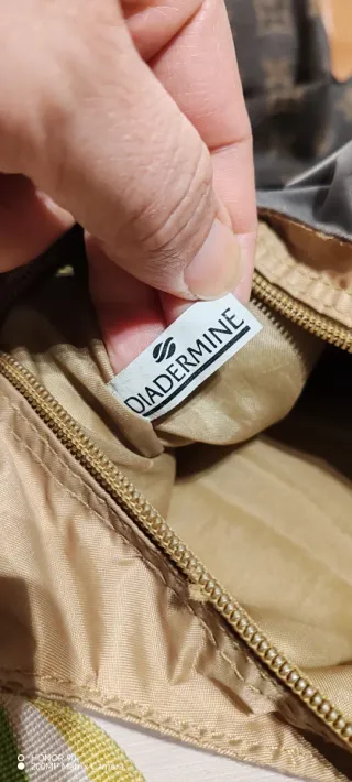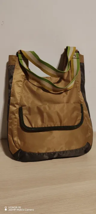 Bolso de mano dorado y verde con un diseño moderno y práctico. - Material: nailon. - Color principal: dorado. - Detalles en color verde. - Asa con rayas verdes y amarillas.