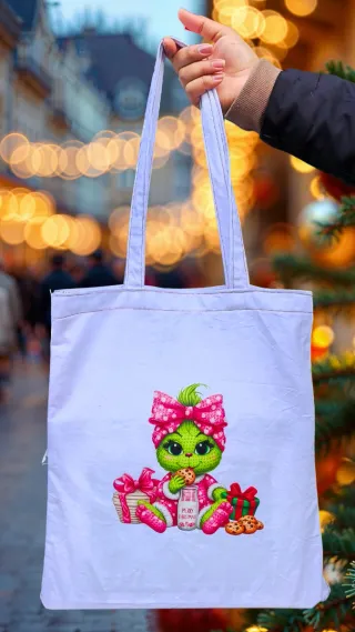 Bolso tote con un adorable diseño navideño del personaje Grinch bebé. Perfecto para llevar tus compras o regalos. - Diseño del Grinch bebé con temática navideña. - Incluye detalles como galletas y regalos. - Estampado festivo y colorido. Artesanal Hecho a mano