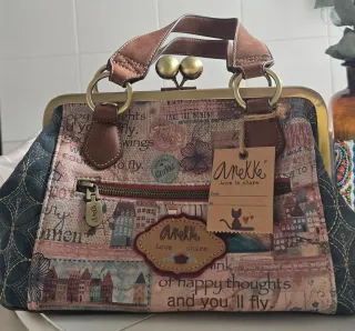 Bolso con un diseño único y lleno de detalles. - Estampado frontal con ciudad y elementos decorativos. - Cierre de boquilla metálico. - Dos asas de cuero. - Charm colgante con figura de Anekke y borla.