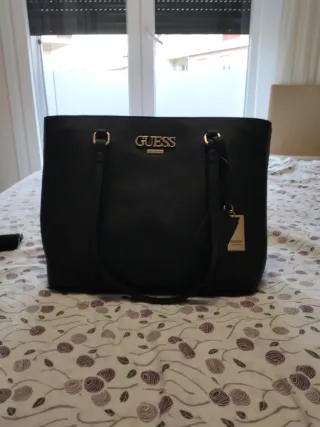 Bolso de mano Guess en color negro, completamente nuevo. - Diseño elegante y espacioso. - Logo metálico de la marca en la parte frontal. - Incluye etiqueta. - Asas cómodas para llevar en la mano o el hombro.