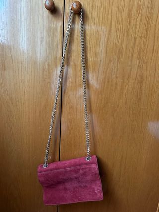 Bolso de mano pequeño en color granate, con un acabado de ante suave y una cadena plateada. - Material: Ante - Color: Rojo - Cadena: Dorada