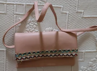 Bolso de mano en tono rosa pálido con un detalle de adorno bordado en la parte frontal. - Adorno con hilos de colores y pequeñas cuentas. - Asa de mano y correa larga ajustable. Largo 17 cm y de ancho 25 cm.