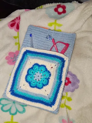 Funda artesanal para proteger tu libro o e-reader. Diseñada con un bonito patrón. - Tejida a mano con hilo de algodón. - Decorada con un motivo floral central. - Cierre con cordón y abalorio.