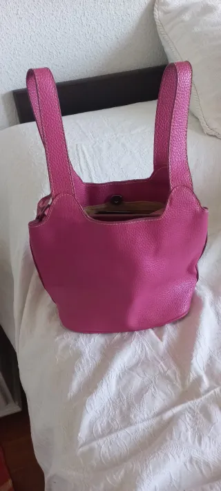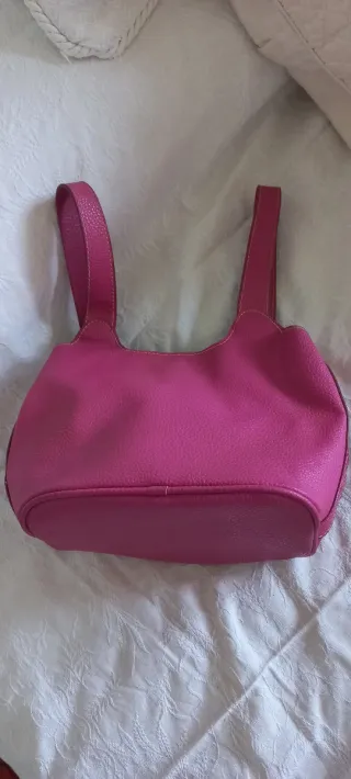 Bolso de mano o al hombro en tono rosa, con un diseño moderno y detalles texturizados. En buen estado - Material: Piel sintética.