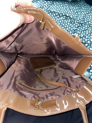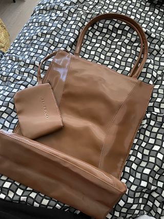 Bolso de mano JUTECO en color marrón. Un accesorio elegante y versátil. - Acabado brillante tipo charol. - Incluye un pequeño neceser a juego.