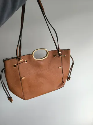 Bolso de mano con un diseño elegante y moderno. - Asa doble para llevar al hombro o en la mano. - Cierre superior con cremallera. - Detalles metálicos dorados.
