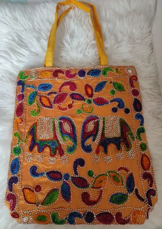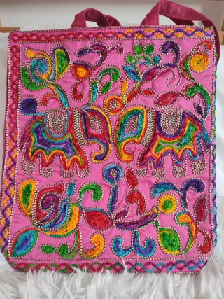 Bolso de mano con un diseño vibrante y colorido, perfecto para añadir un toque único a tu estilo. Medidas: 40cm largox 35 cm ancho, el asa mide 60cm - Adornado con bordados detallados de elefantes y motivos florales. - Ribete exterior con puntadas decorativas. - Asas amarillas para llevar cómodamente.