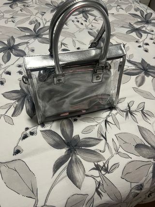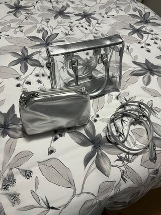 Set de dos bolsos plateados. - Bolso transparente con detalles plateados. - Bolso pequeño plateado con cremallera. - Incluye correa. - Diseño moderno.