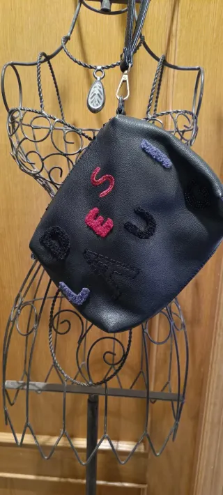 Bolso de mano con un diseño llamativo y original. - Detalle de letras bordadas en relieve. - Combinación de colores vibrantes sobre fondo negro. - Asa corta para llevar en la mano.