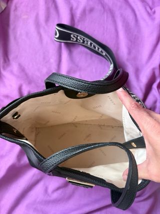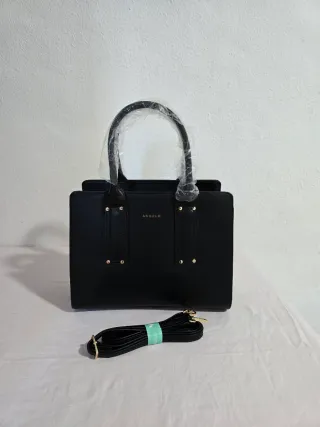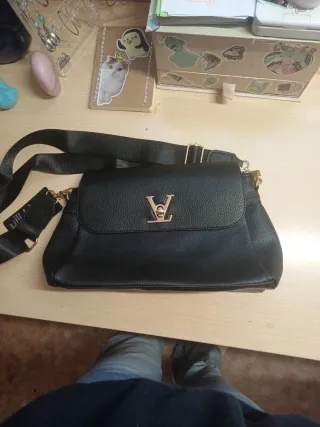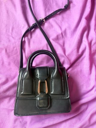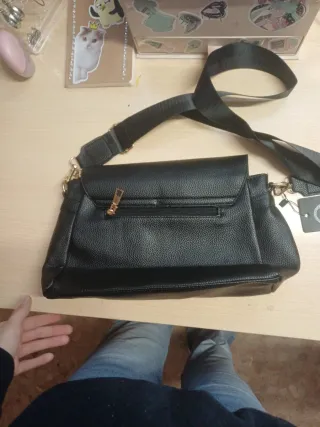 Bolso de mano o bandolera en color negro. - Diseño elegante con detalle de logo dorado. - Correa ajustable para llevar cruzado o al hombro.