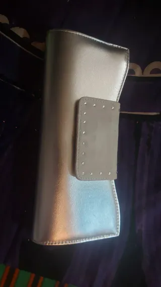 Elegante bolso de mano con un acabado plateado brillante. Presenta un detalle de solapa con tachuelas que le añade un toque moderno. - Diseño tipo sobre. - Solapa con cierre. - Adornos de tachuelas.