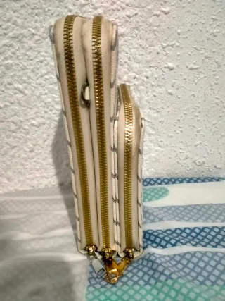 Elegante cartera con el distintivo monograma MK de Michael Kors en blanco y detalles dorados. - Diseño con el logo MK. - Patrón de M repetido en toda la superficie. - Cremallera completa para un cierre seguro.