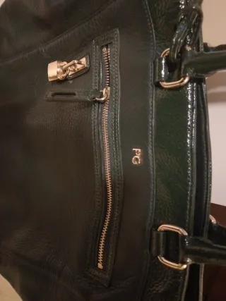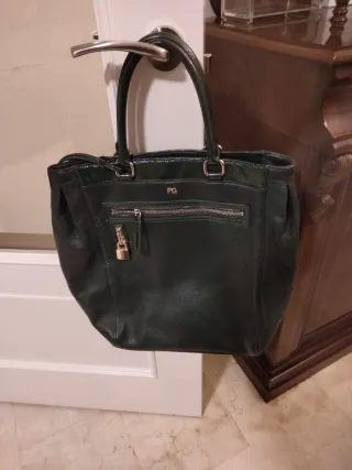Elegante bolso de mano de piel en tono verde. Un accesorio sofisticado y práctico. - Cierre principal con cremallera. - Bolsillo exterior con cremallera y detalle de candado. - Asas de mano cómodas. - Acabado en charol en la parte superior.