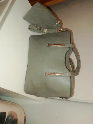 Bolso de mano o bandolera en color verde oliva, con un diseño moderno y elegante. Incluye un neceser a juego. - Cierre de cremallera. - Detalle metálico dorado. - Correa ajustable.