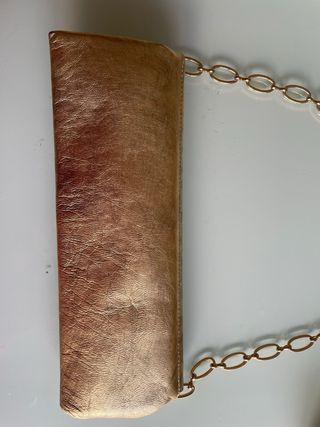 Elegante bolso de mano con un diseño texturizado y un acabado metálico brillante. - Cadena dorada desmontable. - Cierre de solapa. - Diseño floral grabado.