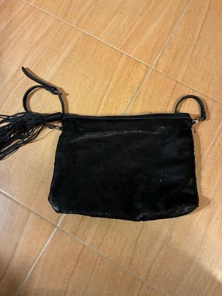 Bolso de mano negro con detalle de flecos. - Diseño con lentejuelas. - Cierre de cremallera. - Asa corta. - Asa larga desmontable.