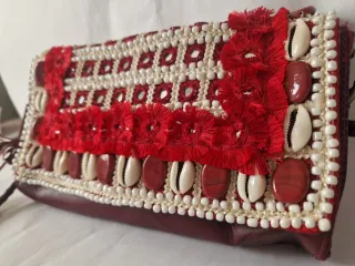 Bolso de mano con un diseño único y artesanal, perfecto para añadir un toque especial a tu look. - Decorado con conchas marinas y abalorios. - Detalle de flecos y flores bordadas. - Correa de hombro trenzada. - Cierre de solapa.