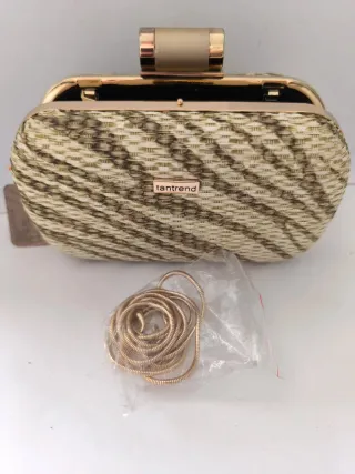 Elegante bolso de mano con un diseño tejido en tonos dorados y plateados. Perfecto para complementar tu atuendo. - Acabado metalizado. - Cadena metálica para llevar al hombro o cruzado. - Cierre de solapa.