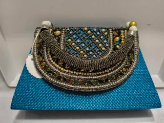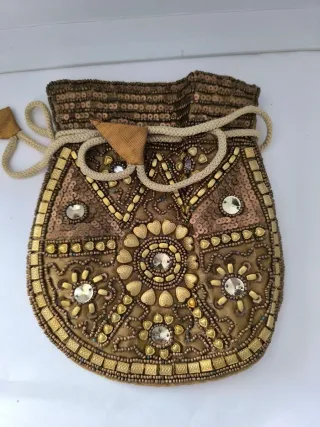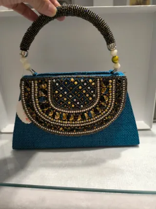 Elegante bolso de mano con un intrincado diseño bordado y detalles de pedrería. - Adornado con lentejuelas y cuentas. - Cierre de cordón. - Asa de cuerda trenzada.