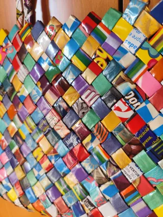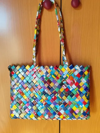 Bolso hecho a mano con materiales reciclados, ideal para darle un toque único a tu estilo. Con cremallera. - Diseño tejido con materiales reciclados. - Asas cómodas para llevar al hombro. - Acabado con un borde festoneado.