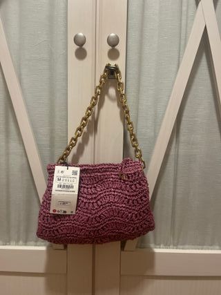 Bolso de mano tejido de Zara, con un diseño moderno y elegante. - Material tejido en color rosa. - Asa de cadena en color dorado. - Cierre de cordón ajustable.