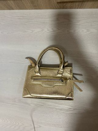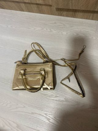 Bolso pequeño de mano con un acabado metálico brillante. Tiene una cuerda para ponerlo en el hombro.